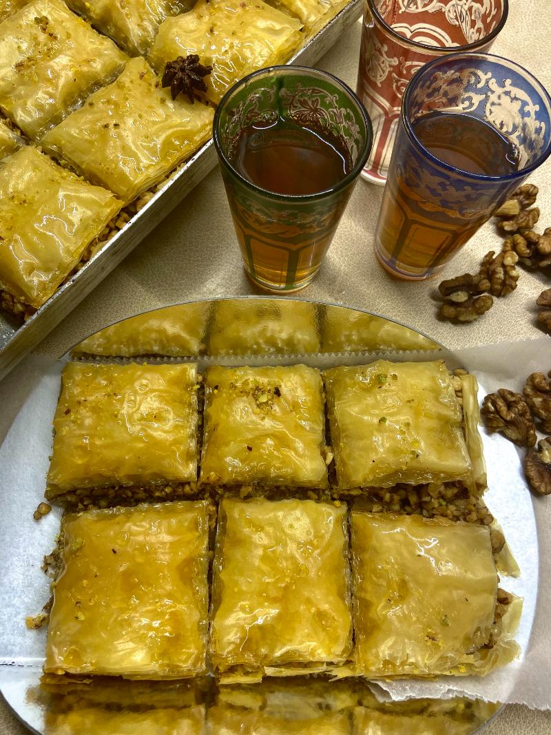 Our baklava is typically made with a mixture of walnut & almonds and occasionally pistachio in a sweet syrup of rose and orange flower water.