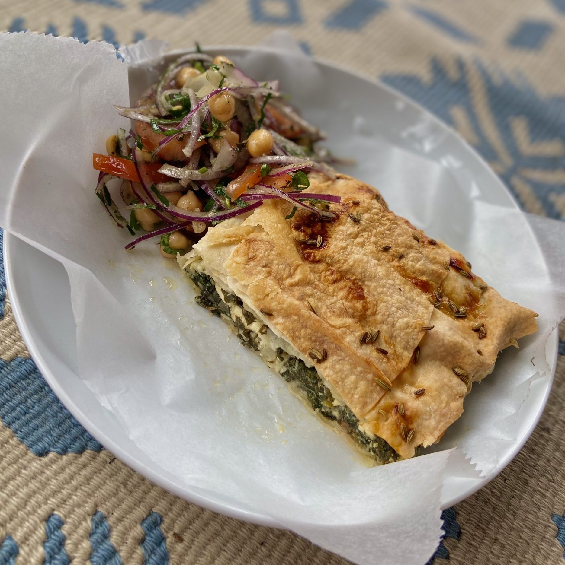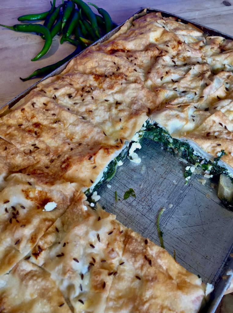 A Savoury Turkish/Greek pie filled with Spinach and Feta with Eggs and onions in Filo pasty