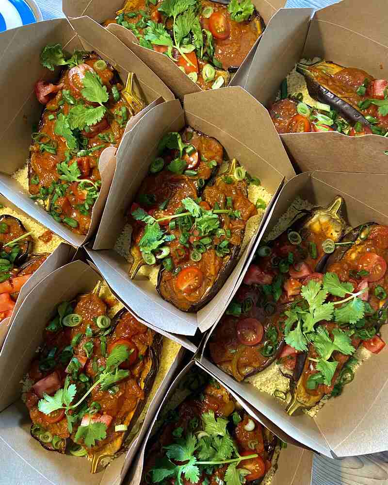 A great favourite. Roasted and stuffed aubergine with onions, tomatoes, garlic and our spices. We top ours with Feta cheese for an extra twist.