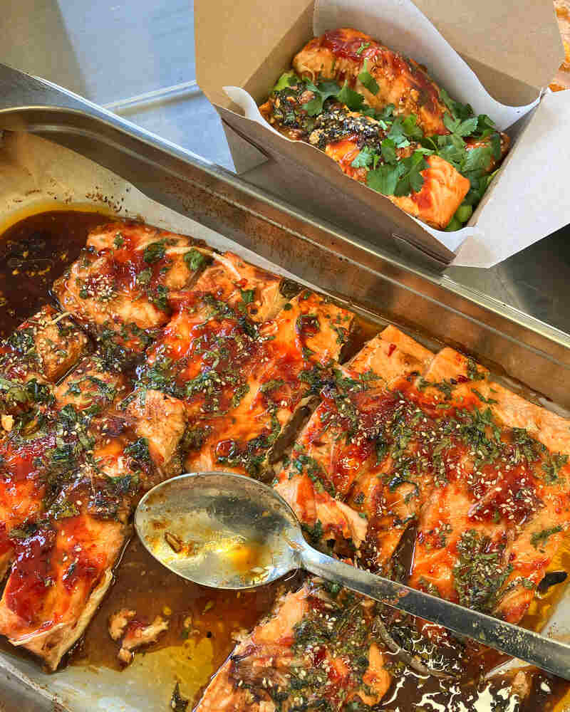 Roasted fillets of sweet chilli, mirin and soy marinated Salmon Fillets. With Noodles or Rice